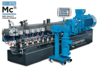 Avec son couple spécifique de 11,3 Nm/cm3, le compoundeur STS Mc11 établit de nouvelles normes : il offre des débits jusqu'à 27 % supérieurs à ceux du modèle précédent, tandis que le degré de remplissage plus élevé de la vis entraîne une diminution de la température de fusion, améliorant ainsi la qualité du composé. Il intègre tout le savoir-faire de Coperion en matière de processus et de qualité.
